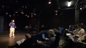 You will audition in groups of 15-20. Your group will be led into the audition room (a black box theatre) and seated on the side of the stage. College representatives will be seated in the center section. Parents are not permitted inside the audition room. Before you begin your audition, you will introduce yourself to the college representatives by stating your name and audition number. Your introduction will not count towards your allotted audition time. You do not need to describe your audition material; state your name and audition number only.